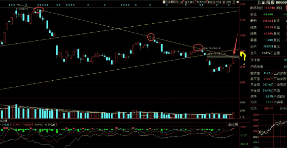 上证指数,经过连续上涨,已经快速收复了2800-2880之间的各种压力和各种缺口,今天强势收在2883上方,但同样面临的很严肃的考验,自四月底下跌3270高点及偏中线结束的3040点和最近一轮大跌2965点组成的下降趋势线和2910附近的跳空缺口。